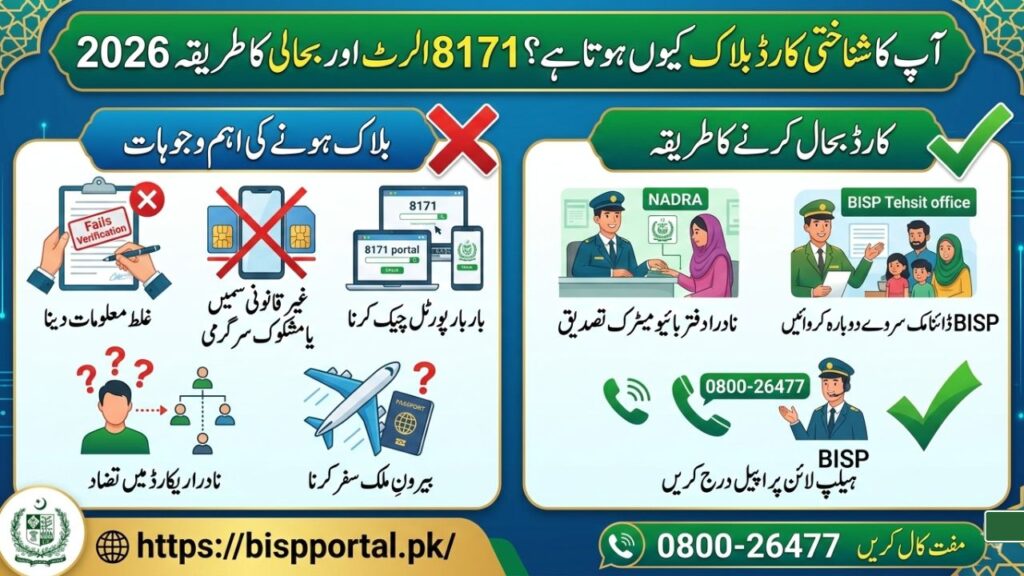 بے نظیر انکم سپورٹ پروگرام (BISP) کے لاکھوں صارفین کو اکثر یہ میسج موصول ہوتا ہے کہ “آپ کا شناختی کارڈ بلاک کر دیا گیا ہے” یا پورٹل پر چیک کرنے پر ان کا اسٹیٹس نااہل نظر آتا ہے۔ شناختی کارڈ بلاک ہونا نہ صرف امداد روکتا ہے بلکہ آپ کے بینک اکاؤنٹ اور سم کارڈز کے لیے بھی خطرہ بن سکتا ہے۔