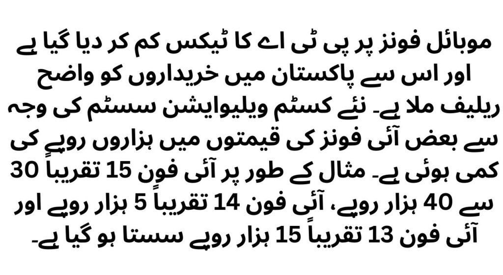 PTA tax on mobile phones has been reduced, and this has brought clear relief for buyers in Pakistan. Because of the new customs valuation system, prices of some iPhones have gone down by thousands of rupees. For example, iPhone 15 has become cheaper by around 30 to 40 thousand rupees, iPhone 14 by about 5 thousand rupees, and iPhone 13 by around 15 thousand rupees.